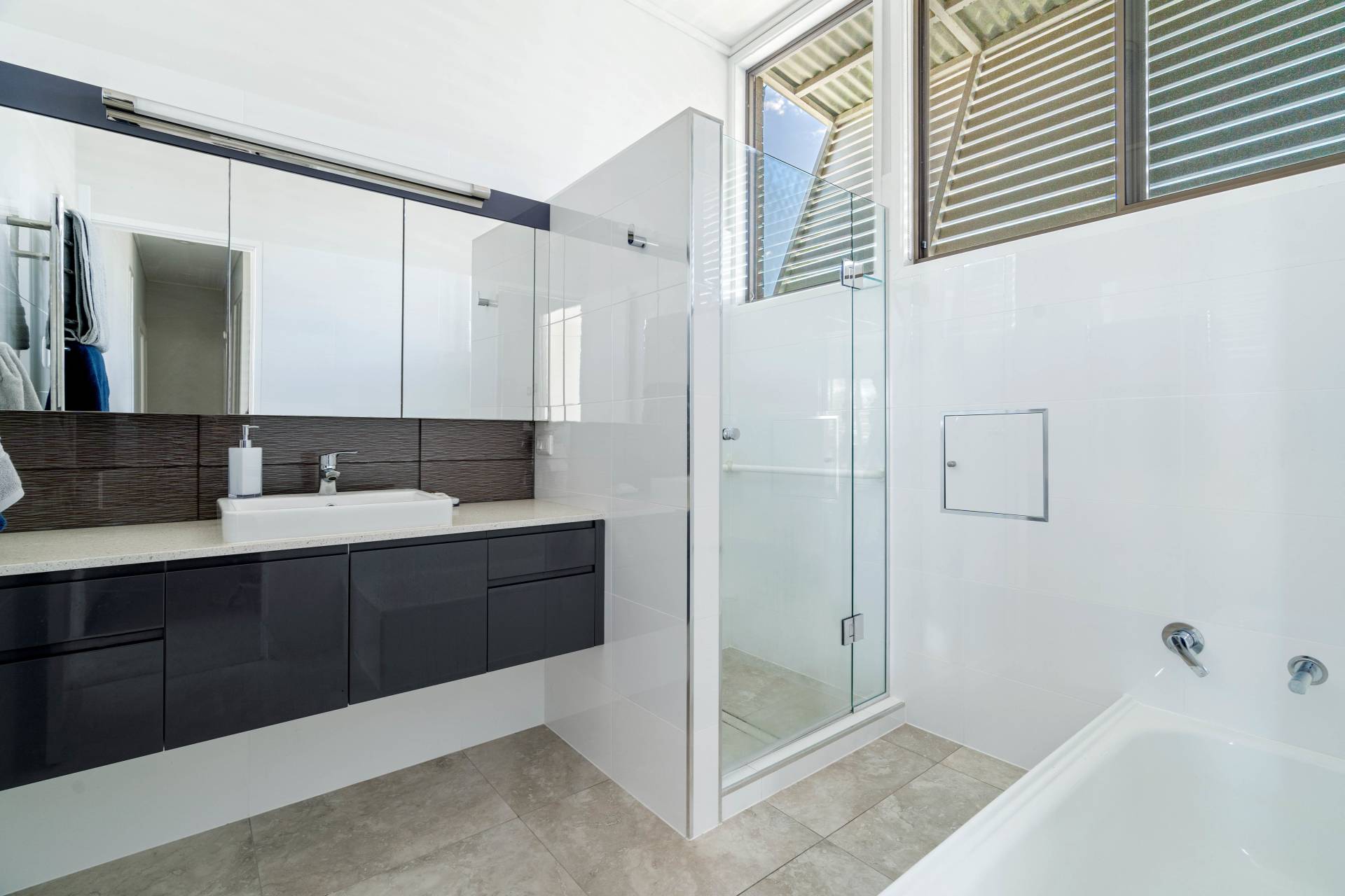 The huge deck with its cantilevered pergola is perfectly oriented to the North East and overlooks the beautifully landscaped pool and surrounds. There’s no shortage of garden space on this big block, it’s fully fenced with privacy front wall and electric gates and includes plenty of room to park a large van and second car, boat or extra family vehicles.