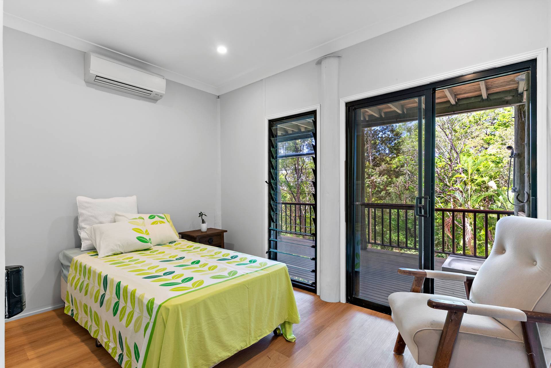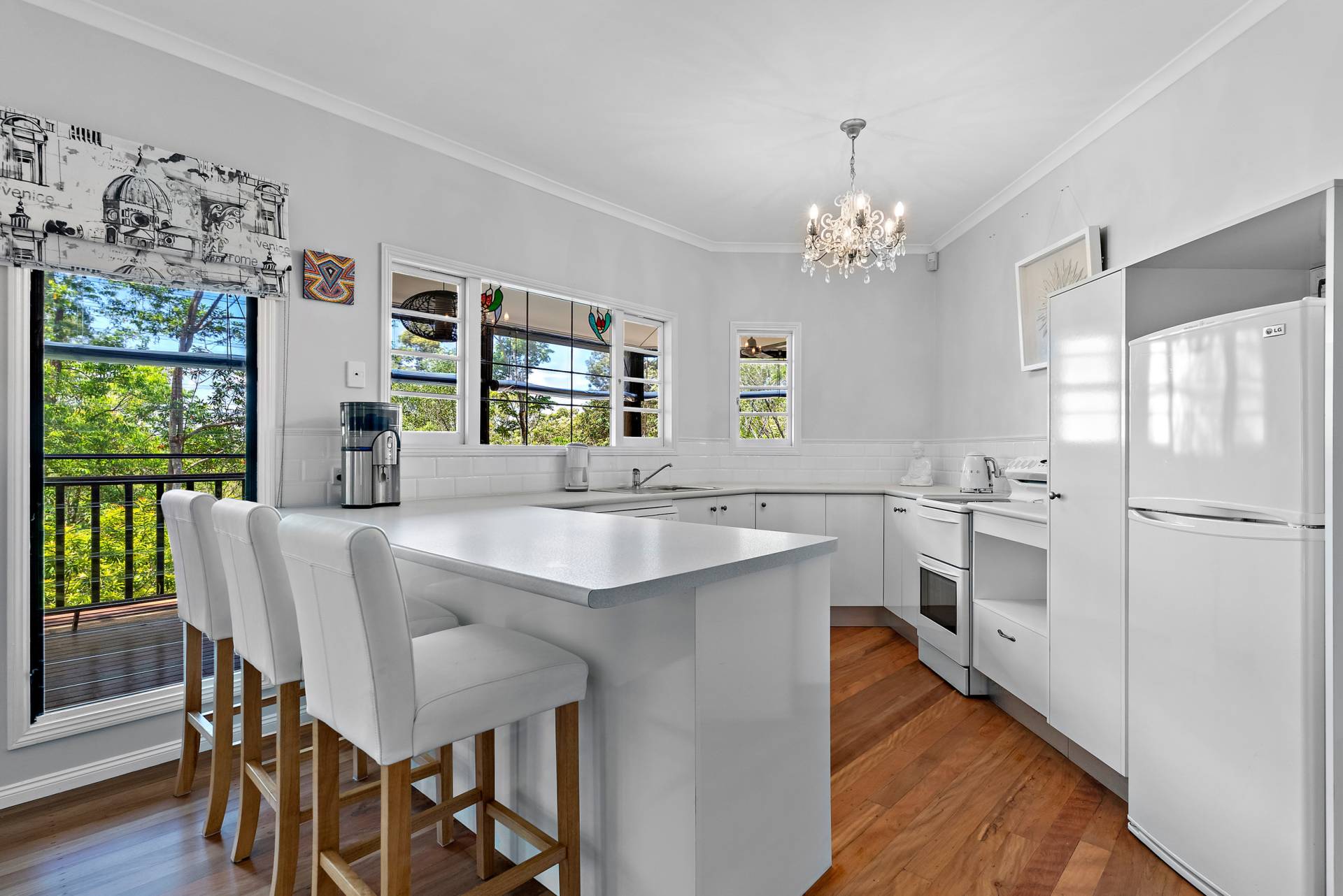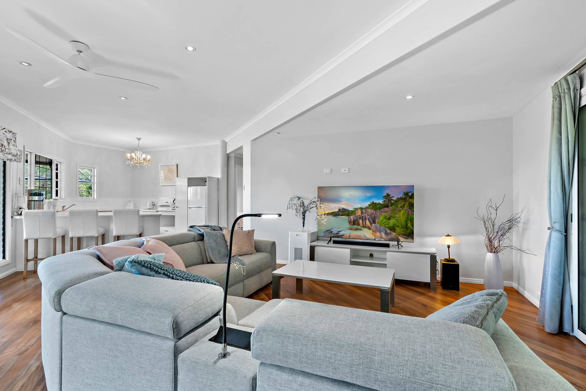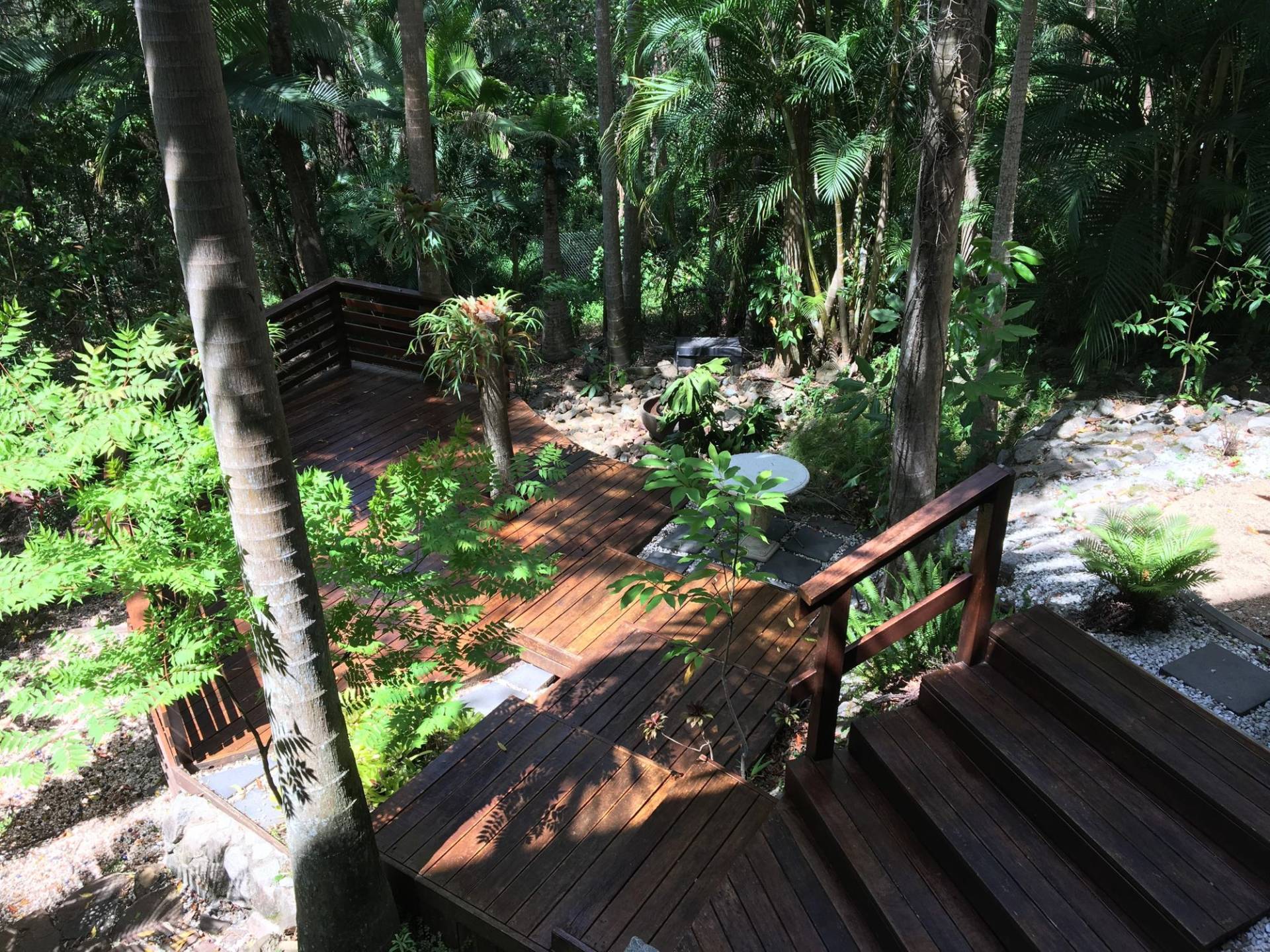What a stunner, you will love this refreshingly distinctive tri-level home set in 1240m2 of tropical grounds with an elevated coastal outlook. Elegantly delivering multiple light filled living zones, each with French doors opening to broad north facing timber decks, the home has a definite air of calm and relaxation. Ideal for a family requiring dual living, or a living and business solution, even Air BnB, with living spaces, bedrooms and bathrooms on each of the 3 levels, in addition to two full kitchens located on the first 2 levels of the home.