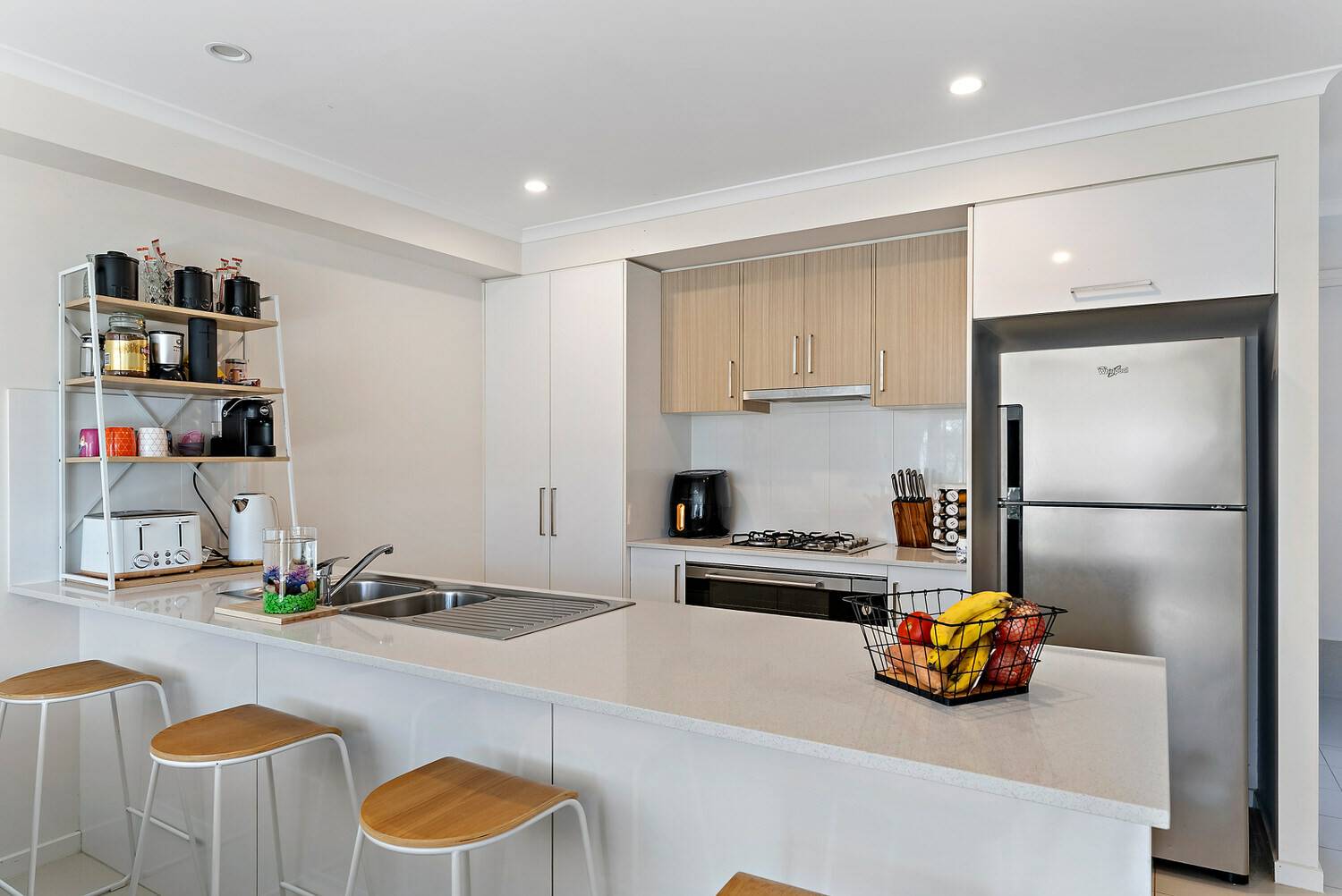 • Stylish kitchen with stone bench tops, stainless steel appliances