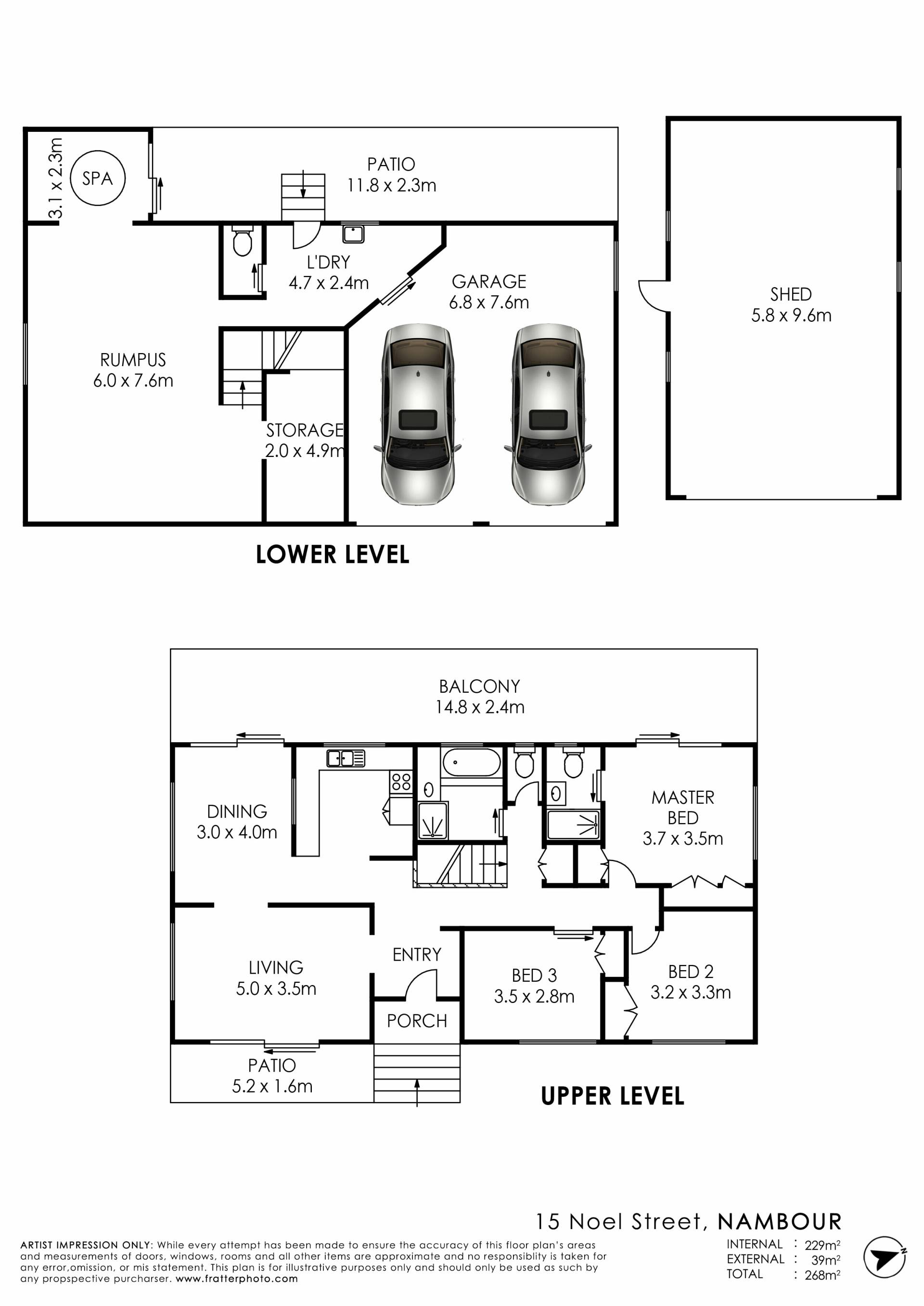 There are 3 bedrooms, 2 bathrooms, a lounge and separate dining room, a front patio and lare entertaining decks. Downstairs is full legal height with a large rumpus room, spa, separate storage room, an additional toilet, laundry and plus size double garage meaning there is potential to expand to a granny flat for extended family, a home business or a little side income. At the rear of the property is a 6m x 9m shed with wiring for 3 phase power connection.