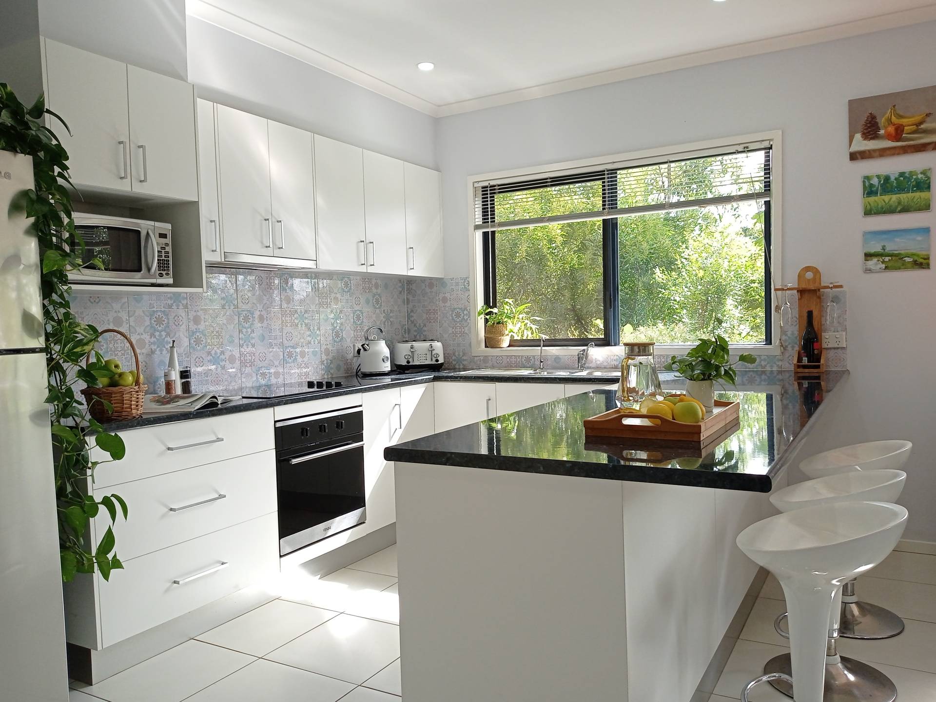 The living and kitchen area is designed for open plan living, with white satin finished cabinetry with electric oven and cooktop, range-hood, microwave nook, plenty of cupboard storage, breakfast-bar, and a large walk-in pantry with ample storage.