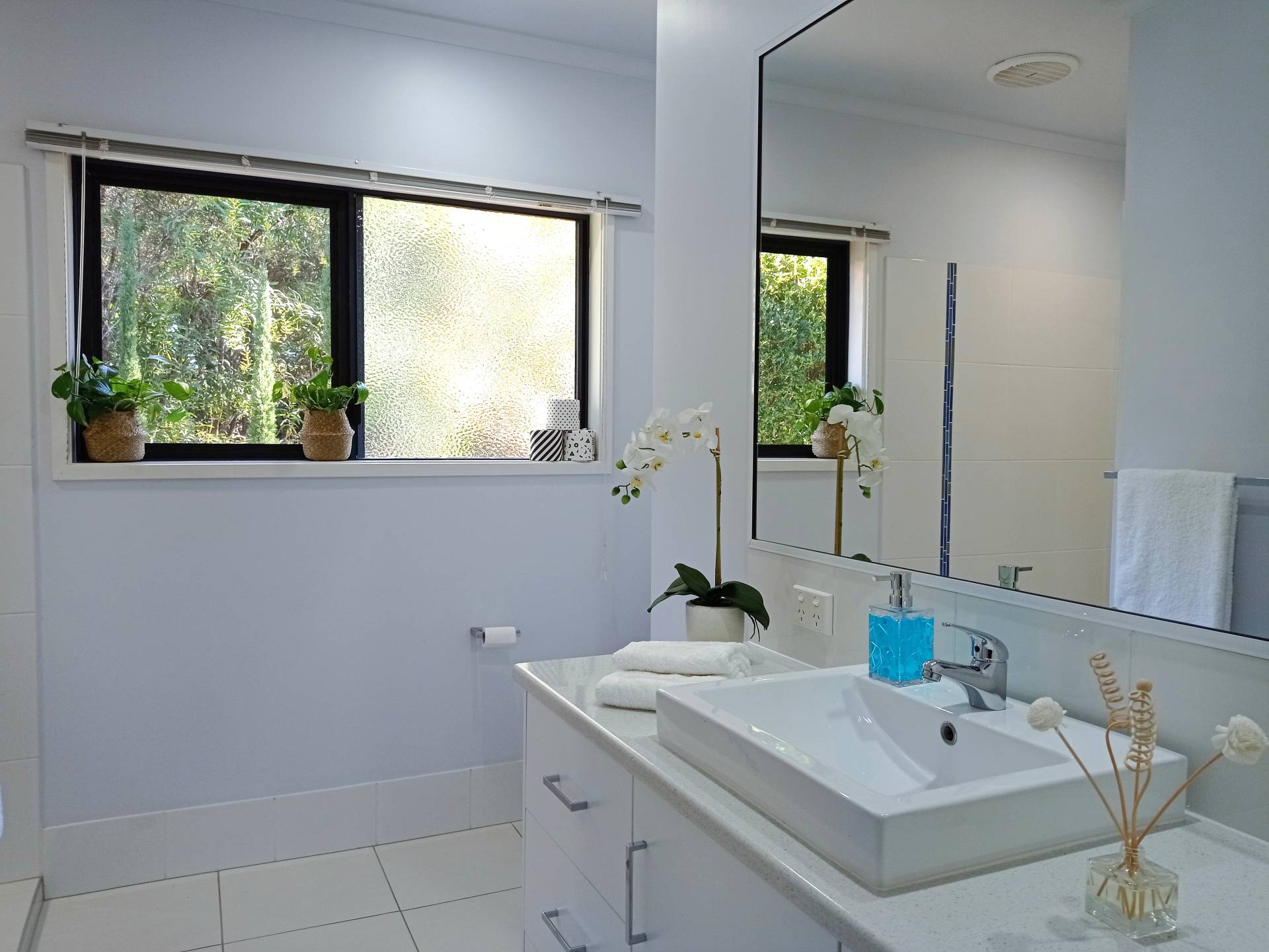 The home features high-ceilings all over (2.7m). There are 4 bedrooms in total; 2 massive king-size bedrooms1 single-bed bedroom, and the master bedroom is in a class of its own! It is comfortable and spacious (+20sqm) that can fit 3 king-sized beds(!), with an oversized walk-in shower and large modern vanity, spacious walk-in robe, ceiling fan, and sliding glass door opening to a private oasis retreat. All bedrooms have built-in robes. Every room has a view overlooking the garden and the natural surroundings.