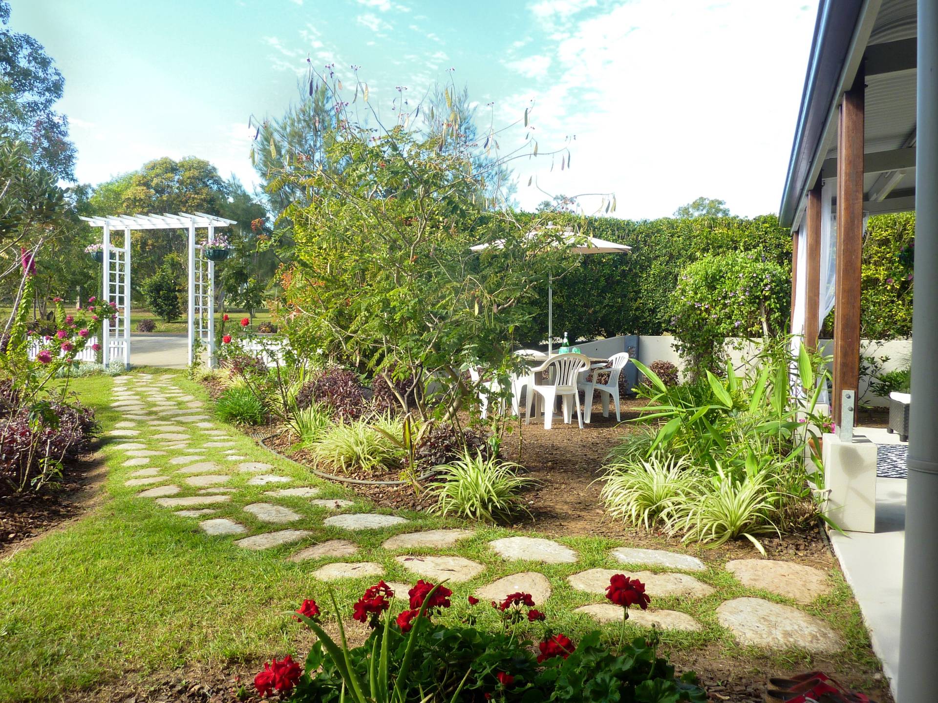 On your right there is a beautiful arch which invites you to enter via a stone pathway where you’ll see a large front patio surrounded by nature. It makes a great place to sit and relaxsipping a cuppa or a glass of wine and overlooking the gorgeous views of the stunning garden.